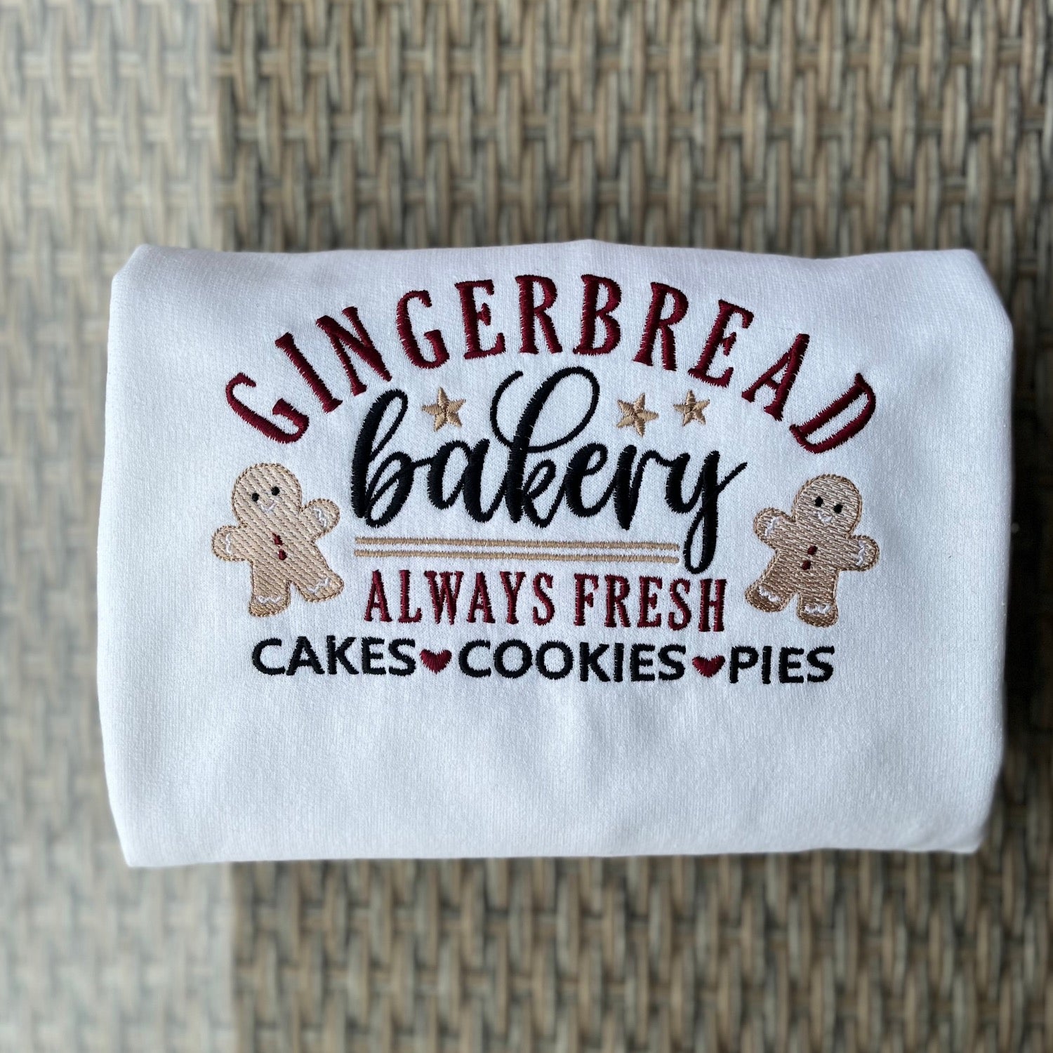 gingerbread bakery sweatshirt, gingerbread Christmas sweatshirt, gingerbread t-shirt, embroidered gingerbread house, Christmas embroidery on clothing, gingerbread sweatshirt embroidery, gingerbread Christmas motif, handmade Christmas gift, vintage Christmas sweatshirt, retro embroidery t-shirt