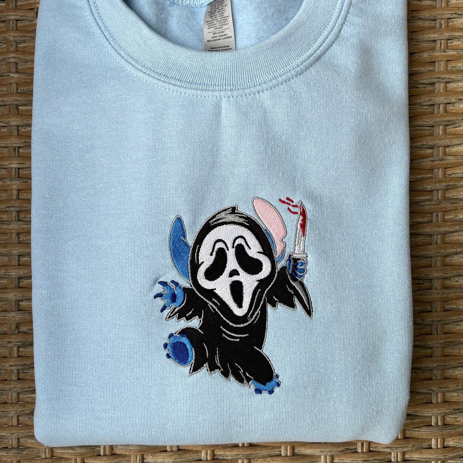 Stitch as a ghost, Halloween embroidery, Stitch embroidery t-shirt, Cartoon ghost sweatshirt, Kawaii Halloween style, Stitch embroidery design, Ghost clothing, Fairytale Halloween sweatshirt, Embroidered ghost clothes, Sweet spooky clothes