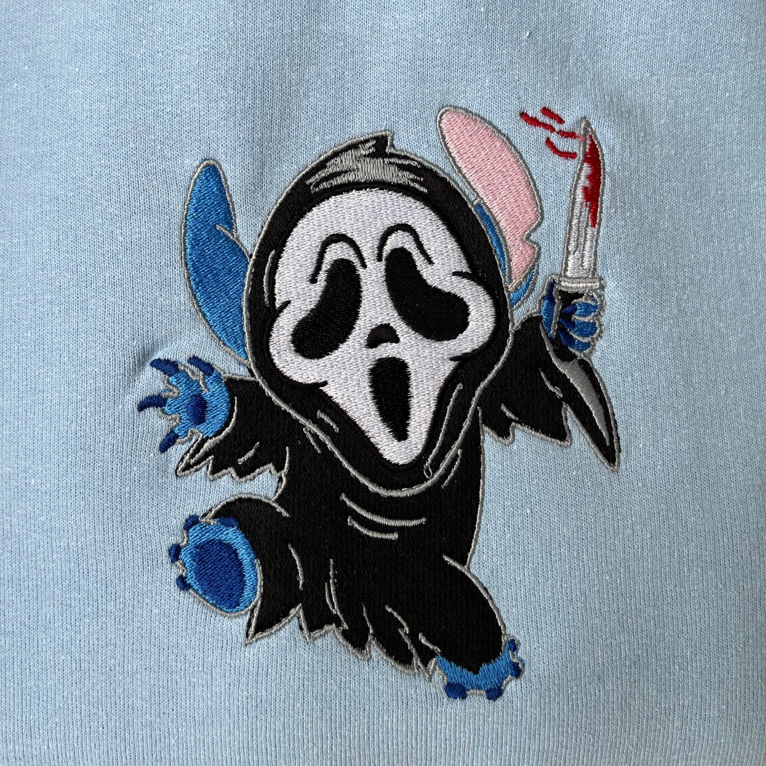 ✔️ An embroidered character inspired by Stitch as a ghost – with large eyes and ears slightly protruding from under the fabric
