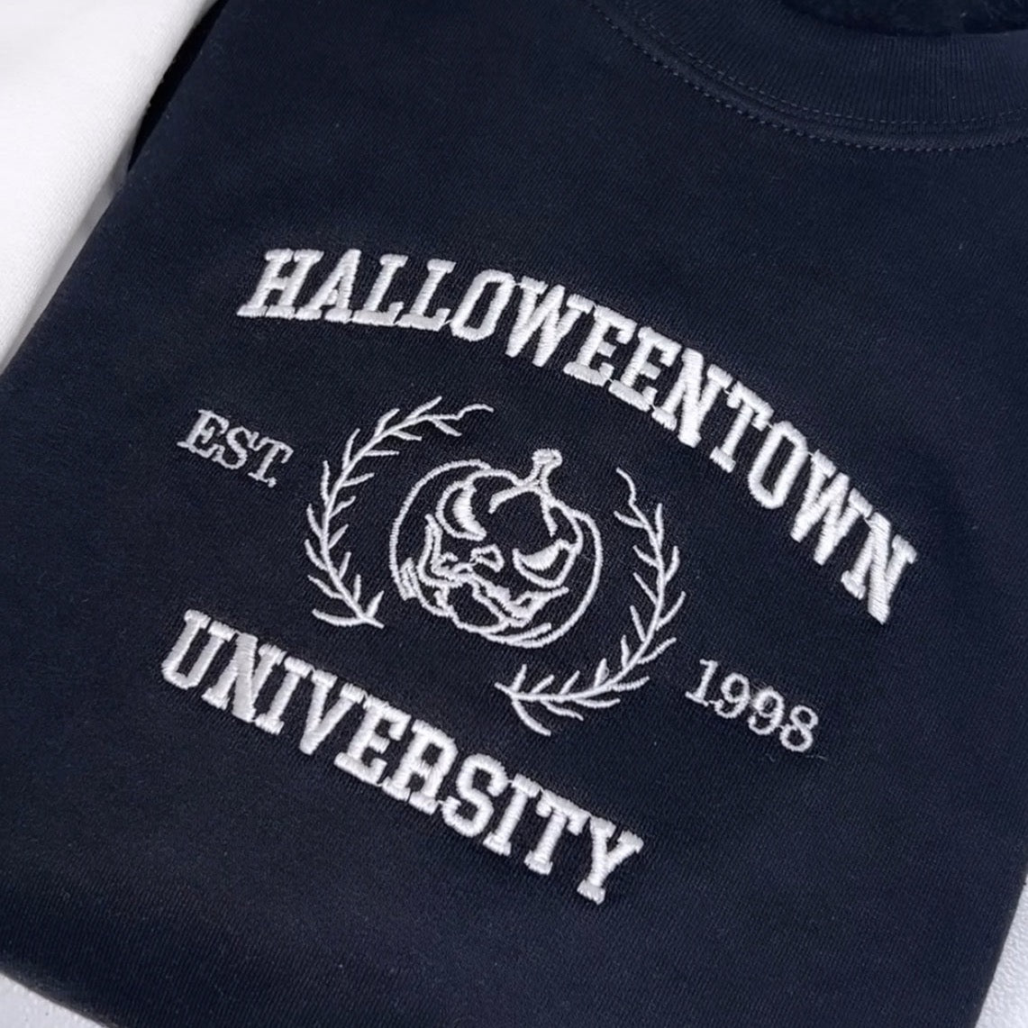 Halloween Town University sweatshirt, Halloween embroidery sweatshirt, spooky university embroidery, creepy cute clothes, gothic college style, pumpkin embroidered t-shirt, ghost college sweatshirt, Halloween aesthetic clothes, witch style sweatshirt, witchcore embroidered clothing, Halloween university style