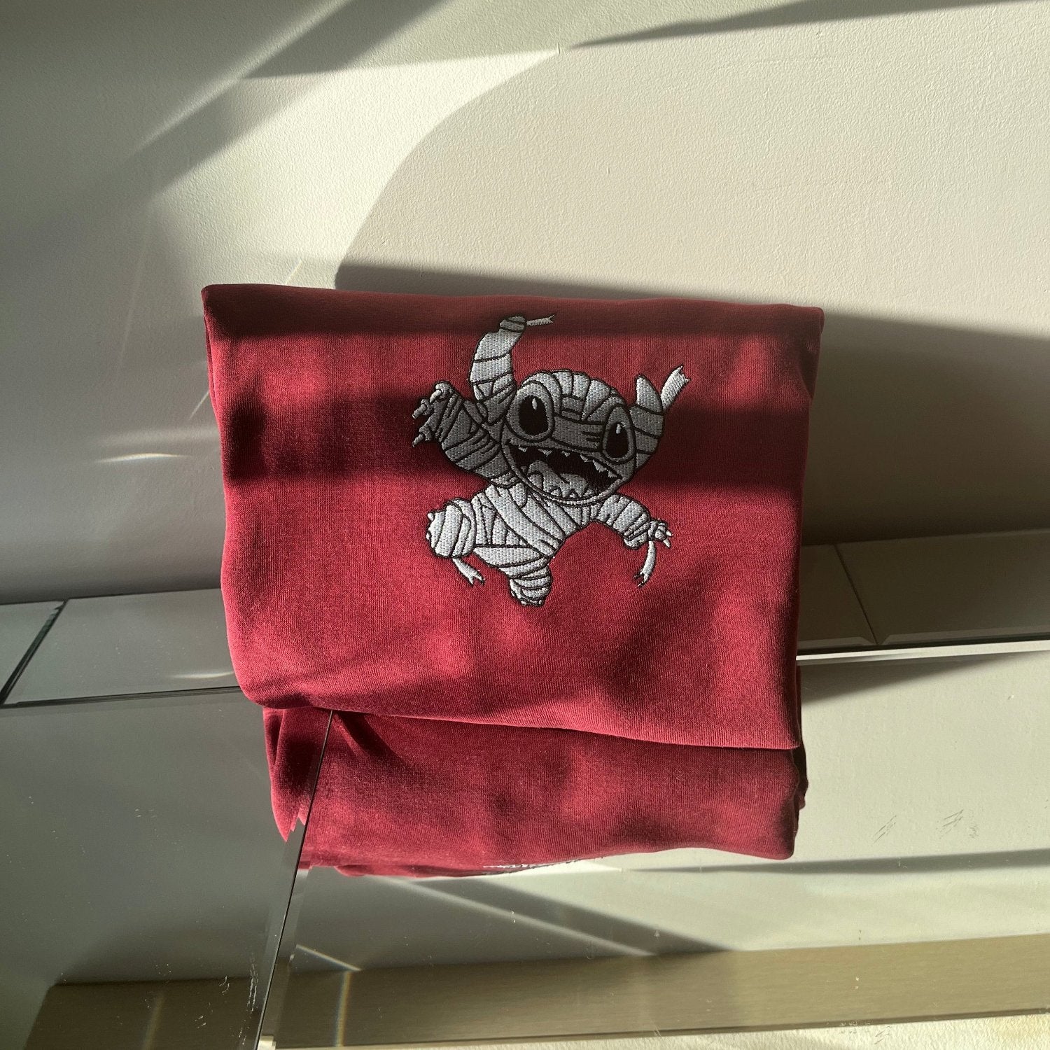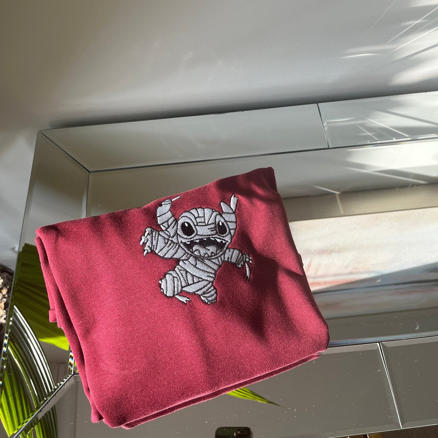 Stitch embroidery sweatshirt, Stitch as a mummy, Halloween t-shirt with embroidery, fairy tale embroidery with a twist, creepy cute embroidery, cartoon streetwear style, clothes for Disney fans, kawaii Halloween embroidery, Mummy stitch sweatshirt, Stitch Halloween design